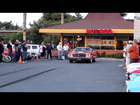 Chevrolet Hot Rod El Camino with a big old 572 doing a burnout in front of the Hot Rod Diner. Electric Cut out exhaust, open headers. Part of a burnout contest, not a burnout fail or gone wrong video. Not drag racing or drift, but this would be a beast if it did.